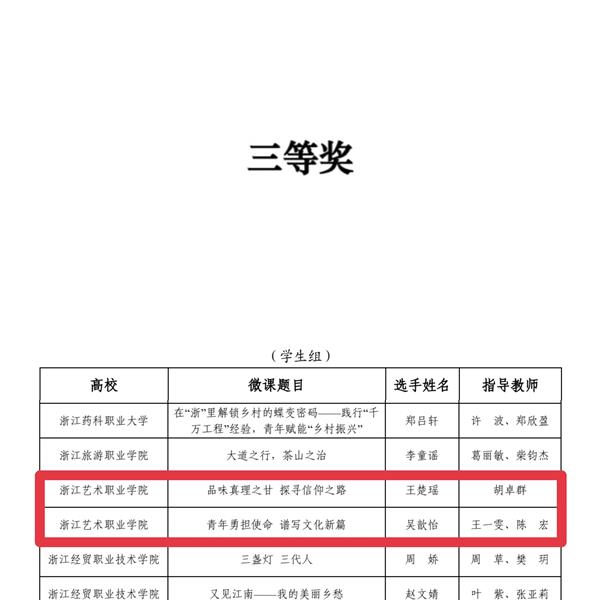 今年3月起,團(tuán)省委、省教育廳、省學(xué)聯(lián)聯(lián)合舉辦了2024年度浙江省高校思政微課大賽。我校推選6位師生的作品參加省賽,其中5件作品從全省107所高校的621件作品中脫穎而出,馬克思主義學(xué)院教師胡芊的微課作品《光影里的家國記憶》、手工藝學(xué)院學(xué)生張金雨的微課作品《蕭然出塵·山止川行 ——一片沙地重生后的二十年 》分別獲得教師組、學(xué)生組二等獎(jiǎng);音樂學(xué)院教師蔣陳竹的微課作品《傳弦樂情 鑄民族魂 》、學(xué)生吳歆怡的微課作品《青年勇?lián)姑?nbsp;譜寫文化新篇》,演藝與教育學(xué)院學(xué)生王楚瑤的微課作品《品味真理之甘 探尋信仰之路》分別獲得教師組、學(xué)生組三等獎(jiǎng)。