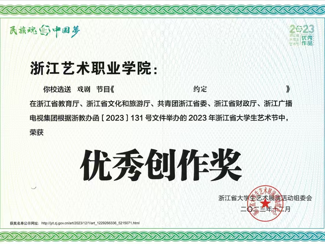 體系思政,涵育時(shí)代新人:學(xué)院構(gòu)建“理論教育+專業(yè)實(shí)踐+價(jià)值引領(lǐng)”三位一體思政體系,創(chuàng)新“專業(yè)+紅色”育人路徑。在課程建設(shè)方面,多門課程先后入選全國(guó)文化藝術(shù)職業(yè)院校線上思政教育典型案例與浙江省高校課程思政優(yōu)秀教學(xué)案例,成果豐碩。在實(shí)踐育人層面,原創(chuàng)清廉微電影《清溪謠》獲全國(guó)高校廉潔教育特等獎(jiǎng)與“玉琮杯”清廉微電影微視頻大賽高校賽道銀獎(jiǎng),示范引領(lǐng)效應(yīng)顯著;師生在浙江省國(guó)際大學(xué)生創(chuàng)新大賽中斬獲佳績(jī),金獎(jiǎng)項(xiàng)目《藝?yán)[生輝——以紅色故事點(diǎn)亮富民之路的演繹先鋒》力拔頭籌;“日行一善”機(jī)制年均服務(wù)超5000小時(shí),“青春文旅志愿行”基地獲評(píng)浙江省社區(qū)教育示范基地。