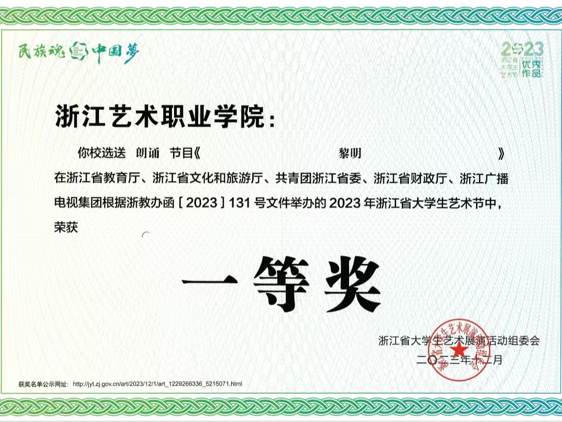 近年來,師生先后斬獲全國(guó)大學(xué)生藝術(shù)展演“個(gè)人專項(xiàng)獎(jiǎng)”、全國(guó)大學(xué)生曲藝優(yōu)秀作品展演“優(yōu)秀劇目”等重大榮譽(yù)。在省級(jí)競(jìng)賽中,學(xué)前教育團(tuán)隊(duì)榮獲浙江省教師教學(xué)能力大賽一等獎(jiǎng)并晉級(jí)國(guó)賽,創(chuàng)學(xué)校歷史最佳成績(jī);學(xué)生奪得浙江省職業(yè)院校技能大賽聲樂器樂表演賽項(xiàng)金獎(jiǎng)、“詩(shī)畫江南·活力浙江”金牌講解員稱號(hào),并在浙江省大學(xué)生藝術(shù)節(jié)、浙江省中華經(jīng)典誦寫講大賽、浙江省大學(xué)生多媒體競(jìng)賽、浙江省高等學(xué)校師范生教學(xué)競(jìng)賽等多項(xiàng)A類學(xué)科競(jìng)賽中累計(jì)榮獲嘉獎(jiǎng)60余項(xiàng),充分彰顯了學(xué)院人才培養(yǎng)的厚積薄發(fā)與全面質(zhì)效。