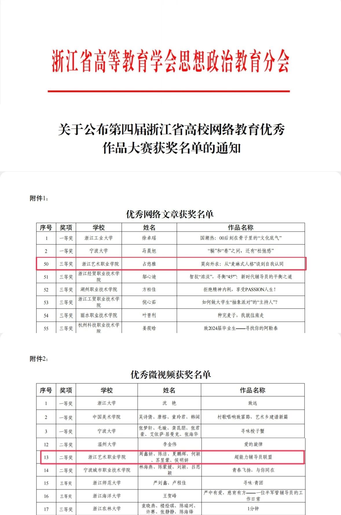 近日,浙江省教育廳宣傳教育與統(tǒng)戰(zhàn)處、浙江省高等教育學(xué)會思想政治研究分會公布第四屆浙江省高校網(wǎng)絡(luò)教育優(yōu)秀作品大賽和第七屆浙江省高校輔導(dǎo)員工作案例大賽獲獎名單,我校輔導(dǎo)員獲得二等獎1項,三等獎2項的好成績。