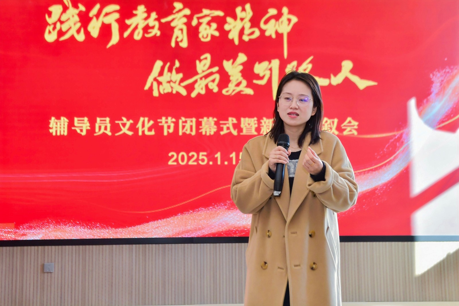 學(xué)工部副部長吳穎回顧了這一年學(xué)生工作的點(diǎn)滴,她表示所取得的成績是在大家傾注心血,播撒汗水中積淀而成的,對大家的辛苦付出表示感謝。她希望2025年輔導(dǎo)員們繼續(xù)向內(nèi)看練內(nèi)功,筑牢根基;向上看務(wù)實(shí)功,勇攀高峰;向外看開格局,做活出彩。面對育時(shí)代新人的時(shí)代使命,大家要善于突破思想藩籬、走出思維定式,工作慣性,用發(fā)展的眼光考慮問題解決問題,與同學(xué)們同頻共振,引發(fā)思想共鳴,把自己工作盤活、出彩。