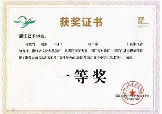 2023年藝術(shù)小品《機“惑”》榮獲浙江省中小學(xué)藝術(shù)節(jié)一等獎,同獲優(yōu)秀指導(dǎo)教師獎