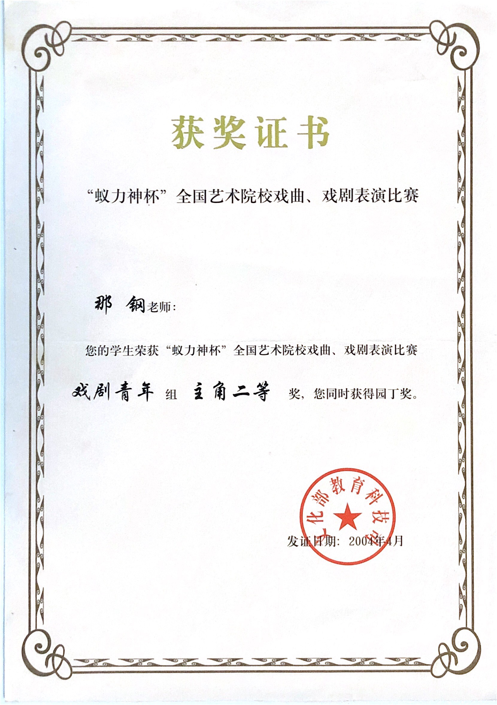 2004年參加“蟻力神杯”全國第四屆戲劇大賽,獲得青年組主角一等獎、配角一等獎,主角二等獎、配角二等獎各一名