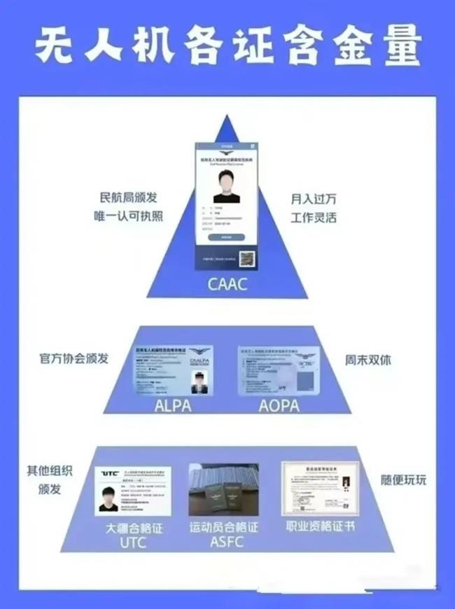 民用無(wú)人機(jī)操控員執(zhí)照是由中國(guó)民航局(CAAC)飛行標(biāo)準(zhǔn)司直接頒發(fā)和管理的執(zhí)照,是唯一由民航局直接頒發(fā)的無(wú)人機(jī)執(zhí)照,具有權(quán)威的法律效力,是全國(guó)通用的駕駛無(wú)人機(jī)的必要證件(類似于汽車駕照)。