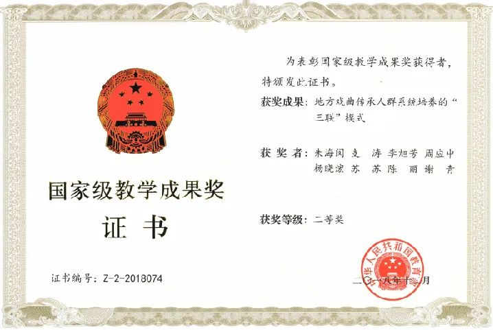 《地方戲曲傳承人群系統(tǒng)培養(yǎng)的三聯(lián)模式》獲國(guó)家級(jí)教學(xué)成果二等獎(jiǎng)