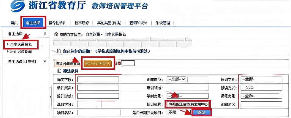 第二步:選擇“自主選課”欄目→“自主選課報(bào)名”→“更多培訓(xùn)班篩選”→培訓(xùn)機(jī)構(gòu)選擇“060浙江省教育發(fā)展中心”(其他選項(xiàng)均選擇“全部”)→點(diǎn)擊“查詢”→“報(bào)名”。