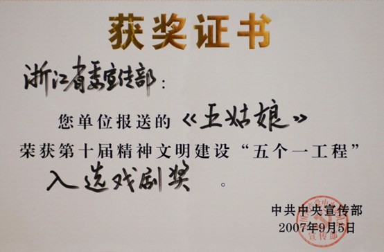 原創(chuàng)音樂劇《五姑娘》參演第七屆中國藝術(shù)節(jié),獲第十一屆“文華大獎”和第十屆精神文明建設(shè)“五個一工程”獎。