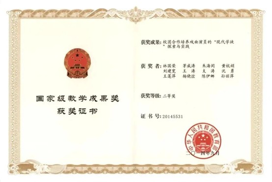 2009年,《以劇目為載體以基地為保障 培養(yǎng)高素質(zhì)高技能舞臺藝術(shù)人才》獲國家級教學(xué)成果二等獎。