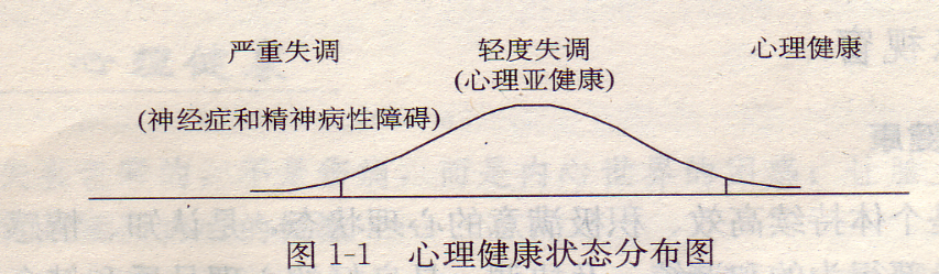 4、心理健康的狀態(tài)具有動(dòng)態(tài)性。心理健康的狀態(tài)不是靜止不變的,而是一個(gè)動(dòng)態(tài)發(fā)展過(guò)程。心理健康的水平會(huì)隨著個(gè)人的成長(zhǎng)、經(jīng)驗(yàn)的積累、環(huán)境的改變,以及自我保健意識(shí)的發(fā)展而發(fā)展變化。大學(xué)生心理健康水平符合正態(tài)分布的規(guī)律,多數(shù)人是健康的。心理健康與不健康之間并不是非此即彼的對(duì)立狀態(tài),從心理健康到心理不健康是一個(gè)連續(xù)狀態(tài),呈正態(tài)分布(圖1-1),每個(gè)狀態(tài)間沒(méi)有絕對(duì)的界限。