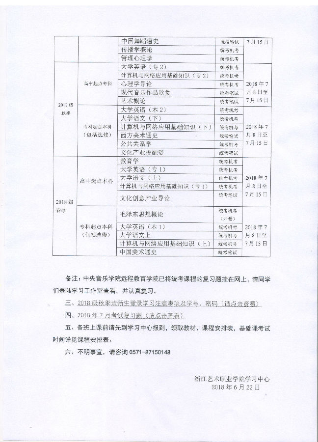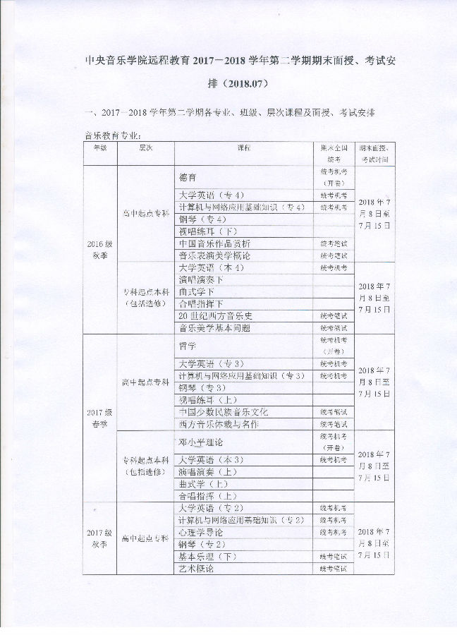 中央音樂學(xué)院遠(yuǎn)程教育2017-2018學(xué)年第二學(xué)期期末面授、考試安排(2018.07).doc