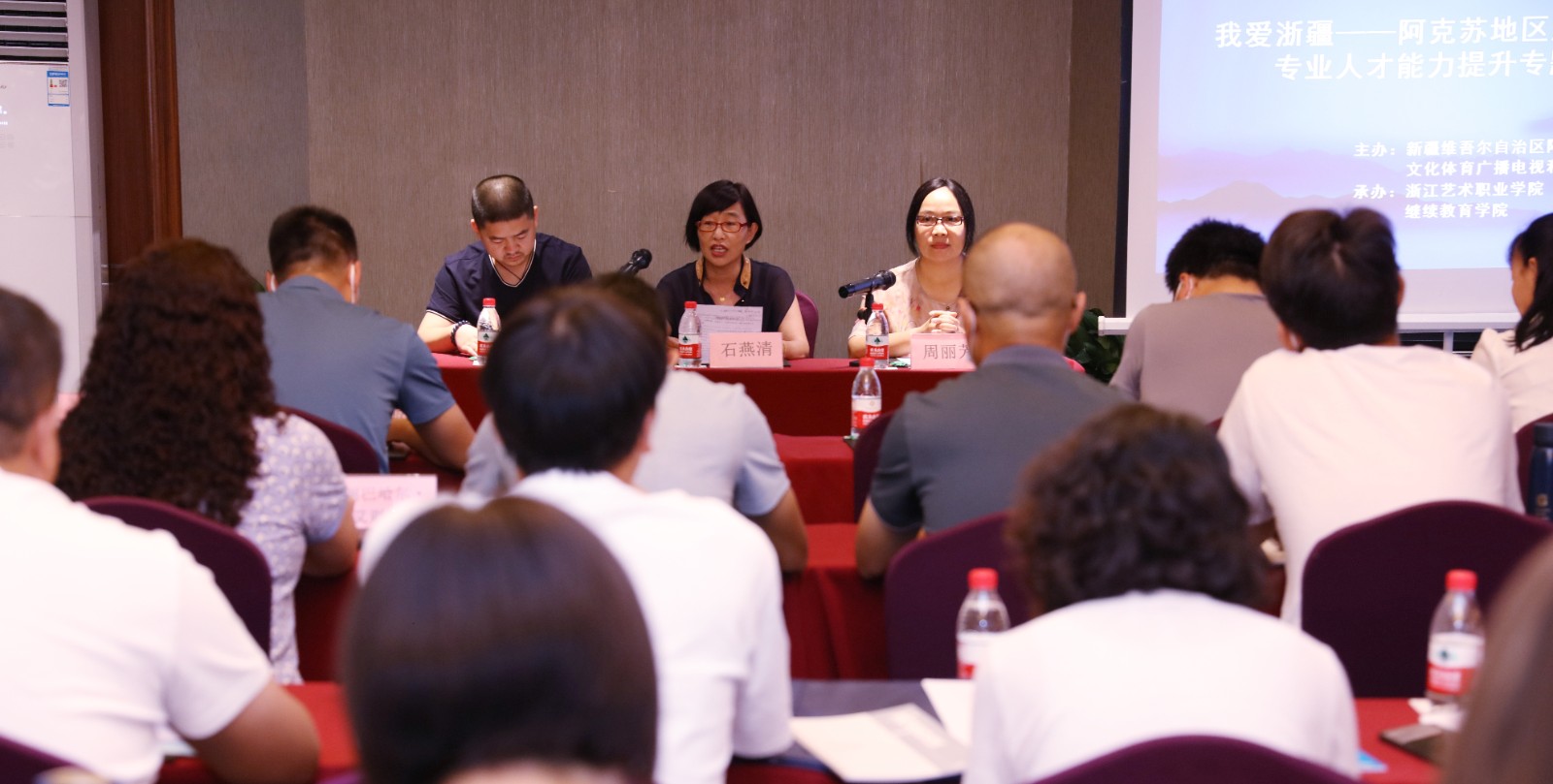 阿克蘇地區(qū)文化體育廣播電視和旅游局四級調(diào)研員石燕清、浙江藝術(shù)職業(yè)學(xué)院繼續(xù)教育學(xué)院院長周麗芳出席開班儀式。開班儀式由阿克蘇地區(qū)文旅局廣電科科長伍偉主持。