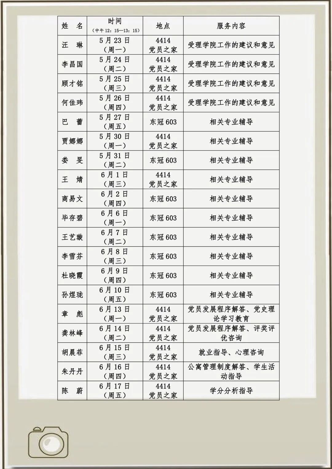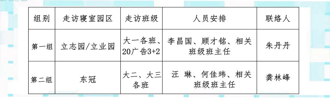 為全面落實(shí)學(xué)校各項(xiàng)管理教育工作,讓班主任充分了解學(xué)生的思想動(dòng)態(tài),更好地關(guān)心同學(xué)們的學(xué)習(xí)生活情況,拉近師生之間的距離,設(shè)計(jì)學(xué)院將學(xué)生工作重心前移至學(xué)生公寓管理中,本月起,今后每月第四周的周三將作為班主任進(jìn)公寓主題日。具體名單安排如下:
