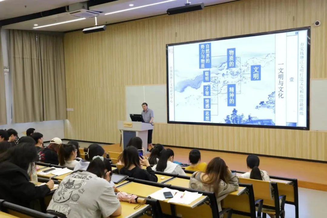 講座上,孫以棟從文明與文化的區(qū)別、錢塘江文明的提出、五大戰(zhàn)略、五大保障四個方面,向學生們生動講述了對夯實錢塘江文明,打造文化和旅游最潮地的展望,并介紹了錢塘江文化的空間格局和業(yè)態(tài)格局,希望錢塘江文明從生活、國際、科技、民族、藝術五個方面形成五大潮。最后,孫以棟以“錢塘江文明勇立潮頭”為總結,并期望通過此次講座,引發(fā)同學們對浙江文化的思考與探索。