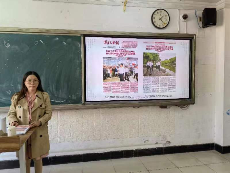 在老師的帶領(lǐng)下,同學(xué)們共同閱讀《浙江日報》2023年9月26日刊登的《始終干在實(shí)處走在前列勇立潮頭 奮力譜寫中國式現(xiàn)代化浙江新篇章》等報道,思政老師們也結(jié)合授課內(nèi)容,對黨報內(nèi)容進(jìn)行了深入淺出的解讀,讓學(xué)生們在熟悉又特別的情景和方式中熟悉黨報、走進(jìn)黨報,引導(dǎo)學(xué)生進(jìn)一步領(lǐng)會習(xí)近平新時代中國特色社會主義思想的世界觀和方法論。