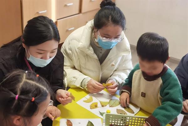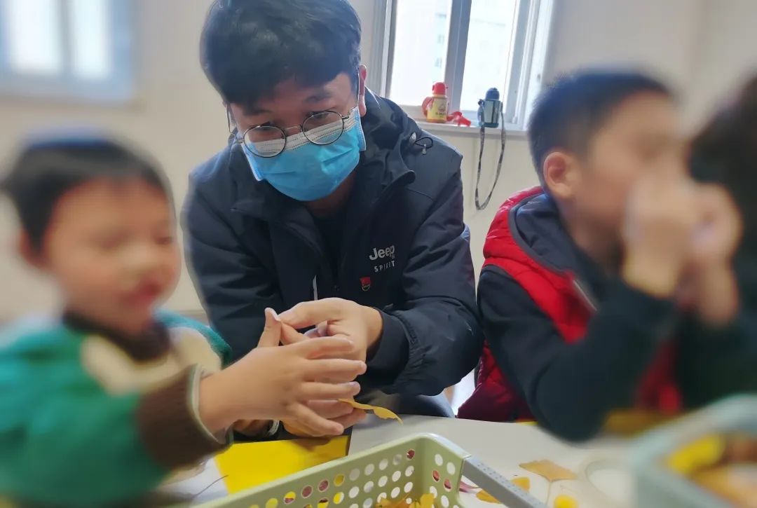 在特需兒童交流互動活動中,志愿者們與小朋友們共同制作樹葉粘貼畫。在制作過程中,小朋友不僅鍛煉了自己的動手能力和想象力,也增進了和志愿者們彼此之間的交流,這些充滿溫暖和善意的作品,如同冬日的陽光,照亮了孩子們的世界,給他們帶來了陪伴與歡樂。