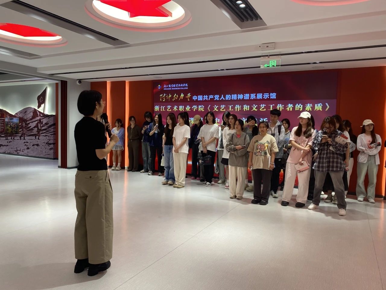 5月22日,《德藝雙馨——文藝工作和文藝工作者的素質(zhì)》課堂上的30余位同學(xué)在馬克思主義學(xué)院直屬黨支部書(shū)記、院長(zhǎng)王筱芽的帶領(lǐng)下,走進(jìn)浙江商業(yè)職業(yè)技術(shù)學(xué)院“精神的力量——中國(guó)共產(chǎn)黨人的精神譜系展示館”上了一堂黨史教育現(xiàn)場(chǎng)教學(xué)課,以紅課潤(rùn)心,在紅館啟航,共話(huà)中國(guó)共產(chǎn)黨百年奮斗的偉大歷程,探尋百年大黨永葆青春的精神密碼。