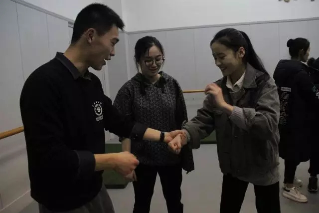 到了實戰(zhàn)演練環(huán)節(jié),沈老師采取分步驟講解,用慢動作將不同襲擊方式的拆解招式一一示范。同學們們興趣高漲,兩兩結(jié)對,相互比劃,外掰手指、索喉抵肘、后拳出擊……每一個動作都練得十分認真。