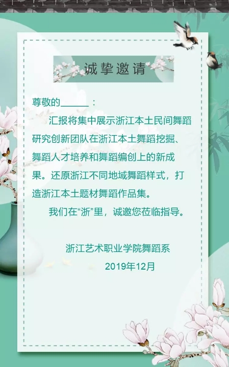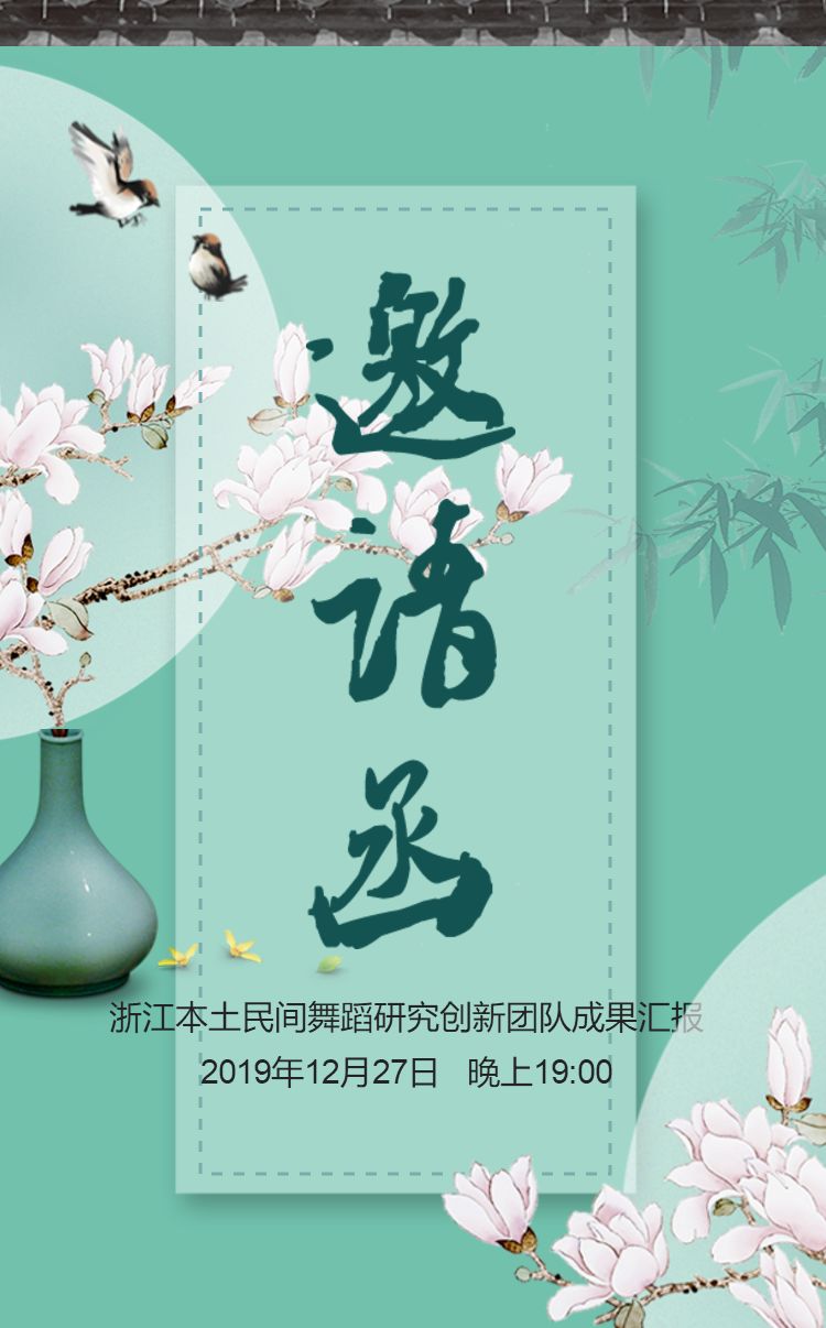 ● 2019年12月27日,我系的浙江本土民間舞蹈創(chuàng)新團(tuán)隊(duì)的成果匯報(bào)將在浙藝實(shí)驗(yàn)劇場(chǎng)舉行