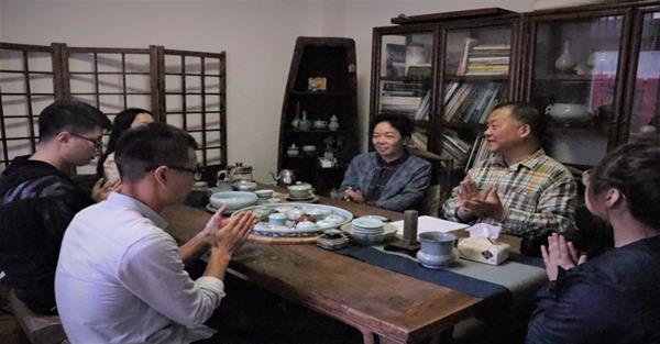 授牌儀式結(jié)束后,文化管理系師生一行前往龍泉市古玩市場拜訪了畢業(yè)后一直從事青瓷行業(yè)的校友—07文鑒班校友劉志勇。謝青代表文化管理系向劉志勇表達了母校的問候與關(guān)心,并介紹了我系近幾年來專業(yè)建設(shè)與取得的成績,劉志勇回顧了在校期間的學(xué)習(xí)與生活,向?qū)W弟學(xué)妹們分享了自己在從事青瓷相關(guān)行業(yè)工作中的努力、成就與困惑,闡述了對未來職業(yè)的規(guī)劃和專業(yè)愿景,并表達了對母校培養(yǎng)的感謝。