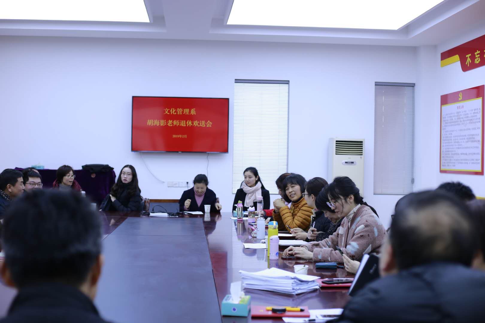 2月27日下午,文化管理系為胡海影老師舉行退休歡送會,歡送胡海影老師光榮退休。學(xué)校黨委委員、副院長沈軍甫,校黨委委員、組織部部長、人事處處長王濤出席歡送會,文化管理系全體教師參加會議,會議由系主任謝青主持。