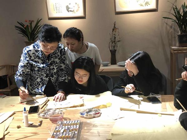 課上,游曉婷為同學(xué)們講解了杭扇的制作流程、注意事項與扇面繪畫技巧。趙平加拿出了工作室的扇繪作品啟發(fā)同學(xué)們的靈感。兩位老師根據(jù)學(xué)生所用花鳥和山水畫臨本的不同,進(jìn)行了逐一的悉心指導(dǎo)。學(xué)生們學(xué)習(xí)和體驗了穿面、扇面繪畫等杭扇工藝制作流程,一筆一畫,精雕細(xì)琢。