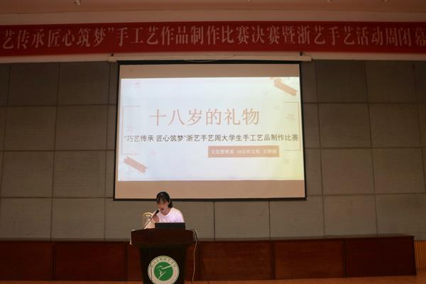 沈軍甫宣布了手工藝比賽獲獎結(jié)果并致閉幕詞。他指出這次活動是我校“浙藝手藝”的一次盛會,也是落實“立德樹人”根本任務(wù)的一項舉措,詮釋我們中華優(yōu)秀傳統(tǒng)文化創(chuàng)造性轉(zhuǎn)化、創(chuàng)造性發(fā)展,增強中國特色社會主義文化自信的一項有力抓手,有利于發(fā)掘?qū)W生的藝術(shù)潛力,發(fā)揮個性特長,提高審美情趣,豐富校園文化生活。他希望這項活動今后能一如既往地開展下去,常做常新,以“浙藝手藝”活動周為契機,把工匠精神傳承弘揚下去,與優(yōu)秀傳統(tǒng)文化同行,以巧思巧藝鑄造匠心之夢!