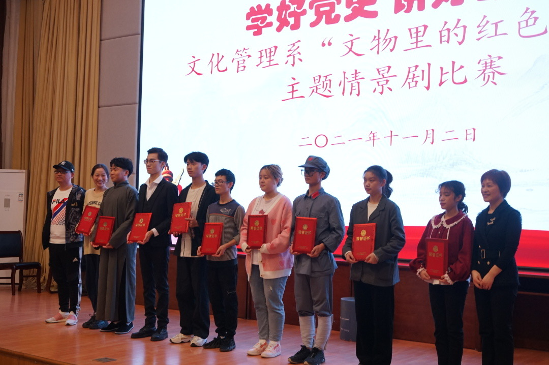 文化管理系黨總支書記金銀琴宣讀了獲獎結果,她對同學們的深情演繹給予充分肯定,同時表示,系里推出“文物里的紅色故事”系列活動,就是希望同學們能夠積極主動地挖掘紅色文物背后蘊藏的感人故事,這些故事里蘊含著我們黨的初心使命、優(yōu)良作風和黨的奮斗精神。希望同學們通過講述這些故事,從黨的百年歷程中汲取奮進的力量,把我們黨的紅色基因一代代傳承下去。