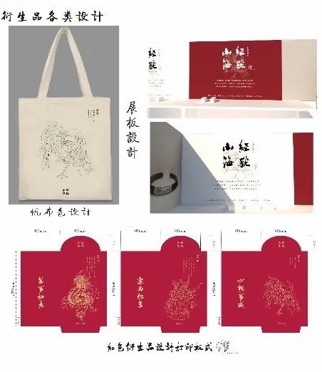 Related literatur& painting ideas 李商隱的愛情詩中這樣寫道:“蓬山此去無多路,青鳥殷勤為探看。”可見這時的青鳥已經(jīng)有了愛情的寓意,當(dāng)時的形象多為小鳥。 但我們翻閱古籍,不難發(fā)現(xiàn),其實青鳥是鳳凰的前身,是猛禽,且赤頭,目黑,居于蓬萊之地。我們就以這樣的形象進(jìn)行繪制。 ● ● 天狗 的相關(guān)文獻(xiàn)及個人繪畫思路 Related literatur& painting ideas 天狗其實很容易被人混淆,歷史上的天狗大致有三只,一只是原山海經(jīng)的,一只是食日的,一只是日本的天狗。山海經(jīng)的天狗,可與后來食日的天狗截然不同。 一是寓意不同,二描述的樣貌也不同,山海經(jīng)里的天狗,雖曰是天狗,但真正考證起來可能是像貍貓的樣子。 《山海經(jīng)·西山經(jīng)》記載,在華山西很遠(yuǎn)的地方,“有獸焉,其狀如貍而白首,名曰天狗,其音如榴榴,可以御兇。“從叫聲和狀如貍都不難看出,并且還是一只御兇的瑞獸。我們同樣依書創(chuàng)作。 燭龍 的相關(guān)文獻(xiàn)及個人繪畫思路 Related literatur& painting ideas 燭龍頗有神話色彩,它是中國古代神話中的鐘山山神,身長千里,通體赤紅,居住于章尾山。 《山海經(jīng)》是這樣描述燭龍的:“西北海之外,赤水之北,有章尾山。有神,人面蛇身而赤,直目正乘。其瞑乃晦,其視乃明。不食,不寢,不息,風(fēng)雨是謁。是燭九陰,是謂燭龍……鐘山之神,名曰燭陰,視為晝,瞑為夜,吹為冬,呼為夏,不飲,不食,不息,息為風(fēng),身長千里。在無綮之東。其為物,人面,蛇身,赤色,居鐘山下。 不管是名字還是書中的描述,我的腦海里一條威武的龍已經(jīng)馬上的浮現(xiàn)在我的腦中。我們抓住特征人面,蛇身,赤色并進(jìn)行繪制。 結(jié)束了圖形的創(chuàng)作,我們便考慮產(chǎn)品應(yīng)用的問題,規(guī)劃了很多,綜合了成本、效果出售率和節(jié)日因素,我們把目標(biāo)放在新年壓歲包上。并把圖案融入手稿、海報,宣傳報等各處應(yīng)用。 ● ● ● ● 排 版 & 設(shè) 計 應(yīng) 用 Typesetting design 【壹】 擬訂的產(chǎn)品和海報設(shè)計 【貳】 制作思路排版設(shè)計 【叁】 畢業(yè)展攤位布置及背景墻設(shè)計 【肆】