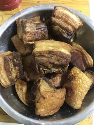 這是為干菜扣肉準備,親朋好友在家里做客吃飯總會有這一道干菜扣肉。肉炸好了,只需要將肉切成小片,在上面撒上自己家里曬的干菜,加醬油蠔油等調(diào)味料蒸就行。主要是因為扣肉本來就是一道比較濃重的菜肴,然后肯定要放在很隆重的節(jié)日,春節(jié)可以說是非常重要的,還有的話就是扣肉代表的意義就是非常隆重的意思,非常喜慶,所以過年的時候就會出現(xiàn)扣肉來迎接新的一年。