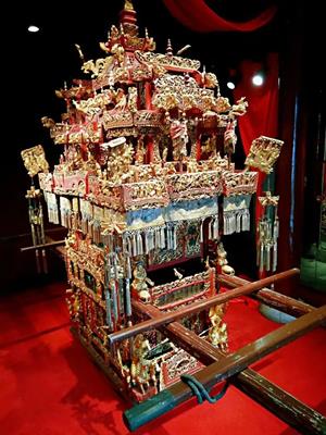 清末民初朱金木雕最杰出的作品,轎上雕有數(shù)百個人物、花鳥蟲獸、故事場景,配以彩色繪鏡片玻璃、寧波金銀繡轎衣和各色小宮燈。利用榫卯技術制作,需花費一萬余工時,是當時彩結貫器店用于出租的頭等轎,也是現(xiàn)存最豪華的一頂花轎。