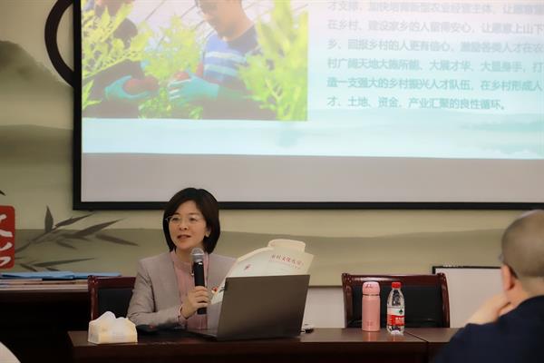 文化管理系主任、教工黨支部書記劉秀峰為大家上了一堂《文化禮堂—從公共空間到美好生活》的主題黨課。她從習總書記關(guān)于鄉(xiāng)村振興的重要論述與國家對鄉(xiāng)村振興戰(zhàn)略的總體要求引入文化振興的重要性與必要性。從推動鄉(xiāng)村產(chǎn)業(yè)振興、人才振興、文化振興、生態(tài)振興、組織振興、推動鄉(xiāng)村健康健康有序進行六個方面講述了農(nóng)村文化禮堂如何發(fā)揮作用,由固態(tài)的公共空間轉(zhuǎn)為活化的人民所向往的美好生活。以浙江鄉(xiāng)村振興戰(zhàn)略實施目標的“五萬工程”引入本土農(nóng)村文化禮堂的建設如何高起點推動鄉(xiāng)村振興,發(fā)揮文化禮堂的功能,喚醒居民對生命共同體的意識,激發(fā)群眾的自覺參與性。她提到,文化禮堂建設要堅持“五個面向”,即面向鄉(xiāng)里鄉(xiāng)親(人)、面向守住鄉(xiāng)愁(地)、面向故鄉(xiāng)記憶(文)、面向回到故鄉(xiāng)(產(chǎn))、面向詩意棲息地(景)。立足禮堂重構(gòu)鄉(xiāng)村秩序、傳承鄉(xiāng)村精神、延續(xù)鄉(xiāng)村歷史文脈、激發(fā)鄉(xiāng)村活力、創(chuàng)造鄉(xiāng)村獨特景觀。最后,她從“宣傳群眾、教育群眾、關(guān)心群眾、服務群眾”闡述了新時代文明實踐中心如何建設。