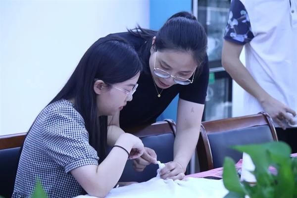 活動(dòng)中,民族傳統(tǒng)技藝專業(yè)教師胡錦霞從扎染的歷史開始講述,生動(dòng)有趣地講述了“學(xué)習(xí)扎染的目的、扎染的特點(diǎn)以及扎染的扎法和染法”等主要內(nèi)容,示范了“困扎法、打結(jié)扎法、任意褶皺扎法、折疊扎法”等多種扎法。