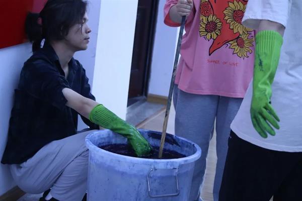 在胡老師的指導(dǎo)下,體驗(yàn)者們將天然質(zhì)地的布料用橡皮筋進(jìn)行捆扎、折疊、扭曲、夾、壓等方式在布的表面創(chuàng)造出漂亮的視覺設(shè)計(jì),然后把捆扎好的布料浸透到調(diào)配好的靛藍(lán)染液桶里,輕柔地用染液滲透布料,同時(shí)搖勻桶里的染液。