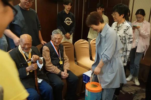 王老和胡老勉勵在座的大學(xué)生黨員們,未來是屬于年輕人的,希望大家不忘初心,把我們的祖國建設(shè)得越來越好。黨員師生和兩位抗戰(zhàn)老兵一起合唱《我和我的祖國》,共同高歌赤誠愛國心。