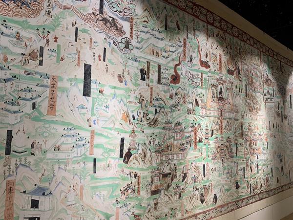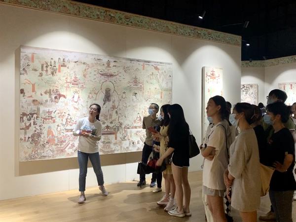 展廳展陳了莫高窟的石窟藝術(shù),分為早期、中期、晚期三個(gè)階段。講解員帶領(lǐng)師生走近敦煌壁畫(huà)藝術(shù),講述莫高窟的大事記。敦煌石窟和敦煌藏經(jīng)洞出土的文物濃縮了中古敦煌的歷史,形象地記載了在開(kāi)放背景下歐亞文明的互動(dòng)、漢民族與其他民族的交融;反映了4—14世紀(jì)一千多年間佛教及藝術(shù)的流傳及流變;保存了豐富生動(dòng)的中外藝術(shù)形象及藝術(shù)的源流傳承;展示了中古時(shí)期廣闊的政治、軍事、文化、科技等社會(huì)生活的場(chǎng)景,具有超越時(shí)空經(jīng)久不衰的魅力,在不同時(shí)代、不同民族、不同信仰、不同地域的人們中間產(chǎn)生共鳴。這也正是中華民族以自己的優(yōu)秀文化為世界做出的貢獻(xiàn)之一。