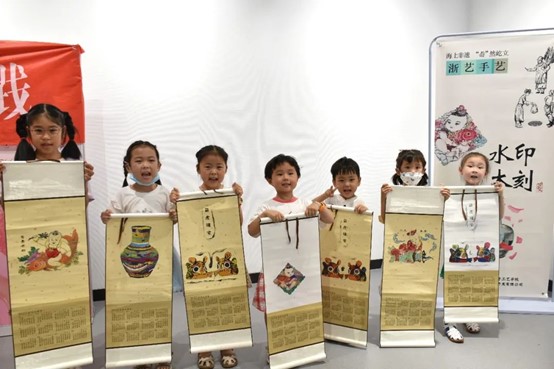 木刻韶年,水印芳華。手工藝學(xué)子現(xiàn)場(chǎng)示范繪、刻、印等一系列制作流程,將宣紙、木板和顏料巧妙融合,一幅幅精美的水印木刻版畫躍然紙上,讓孩子們連連感嘆水印木刻的神奇。