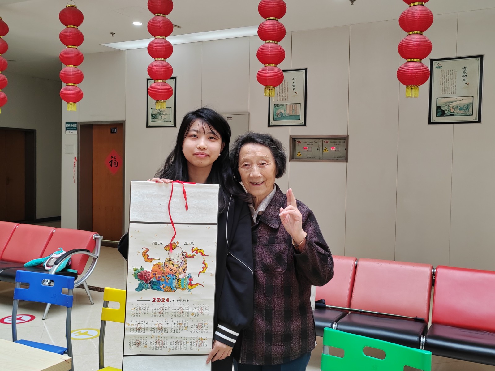 水印木刻活態(tài)體驗(yàn)活動(dòng)中,在“藝小匠”學(xué)生團(tuán)隊(duì)的指導(dǎo)下,老人們蘸取墨水,用刷子為印版上色,均勻地涂抹在刻有傳統(tǒng)紋樣的版面上,對(duì)準(zhǔn)印版平鋪年歷,借助馬蓮來(lái)回旋轉(zhuǎn)按壓,印版上的圖案由此拓印成功,后輔以水彩上色,獨(dú)具特色的新年年歷順利完成。