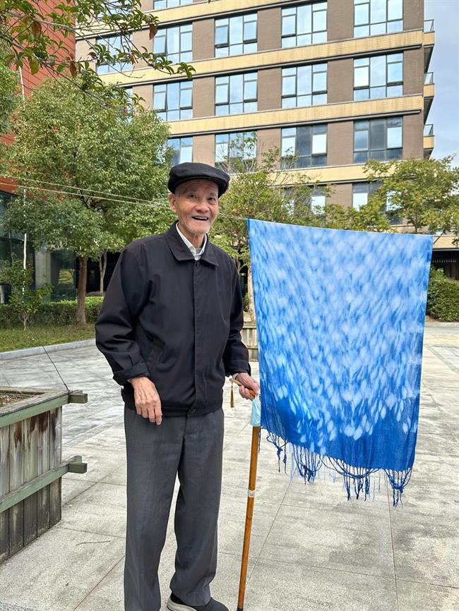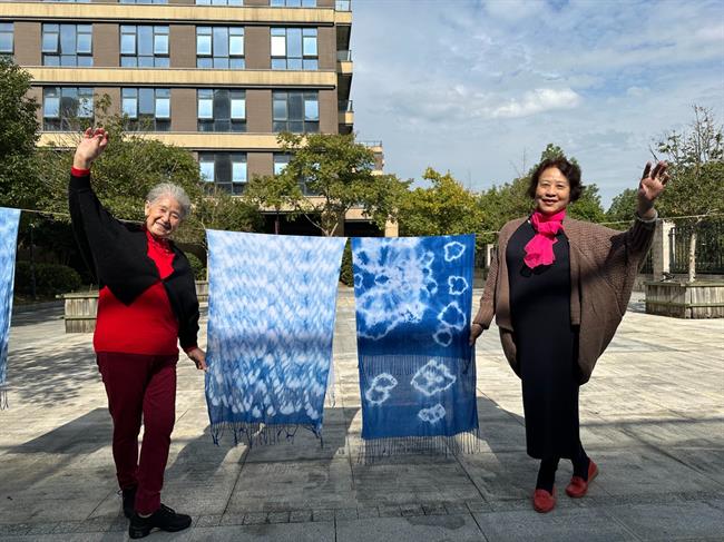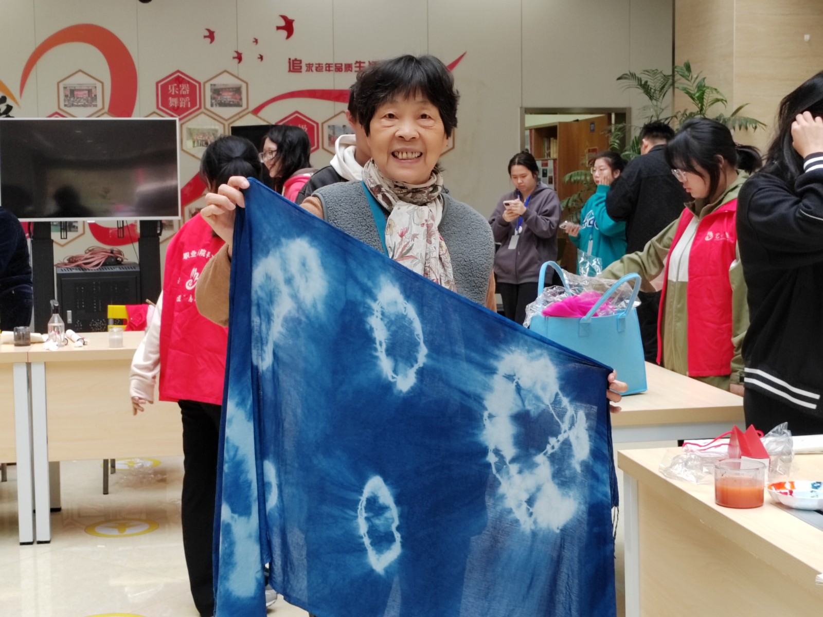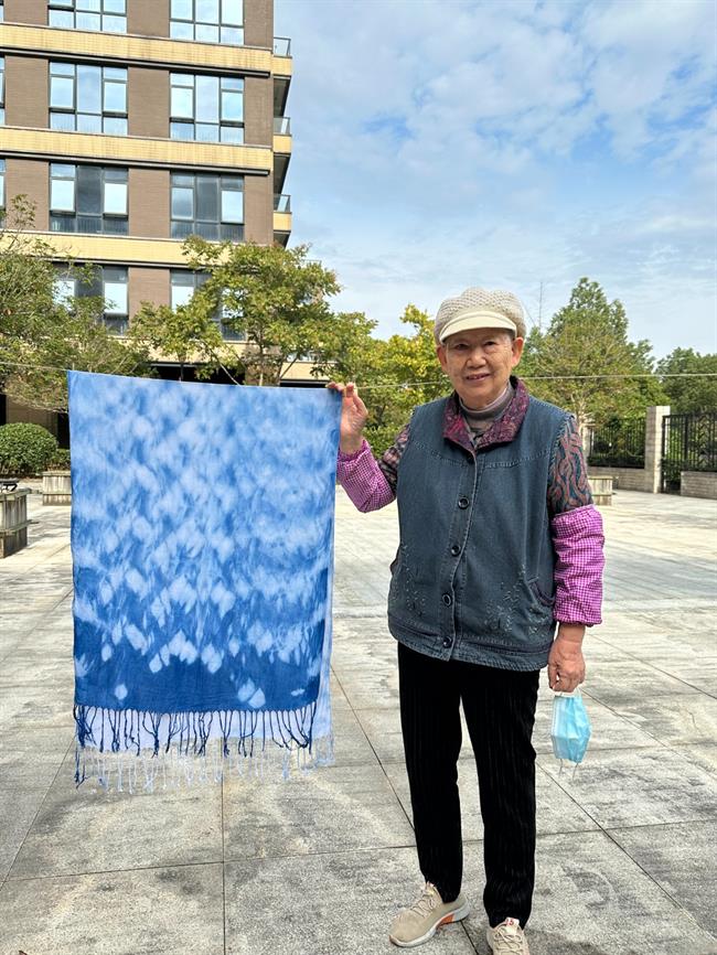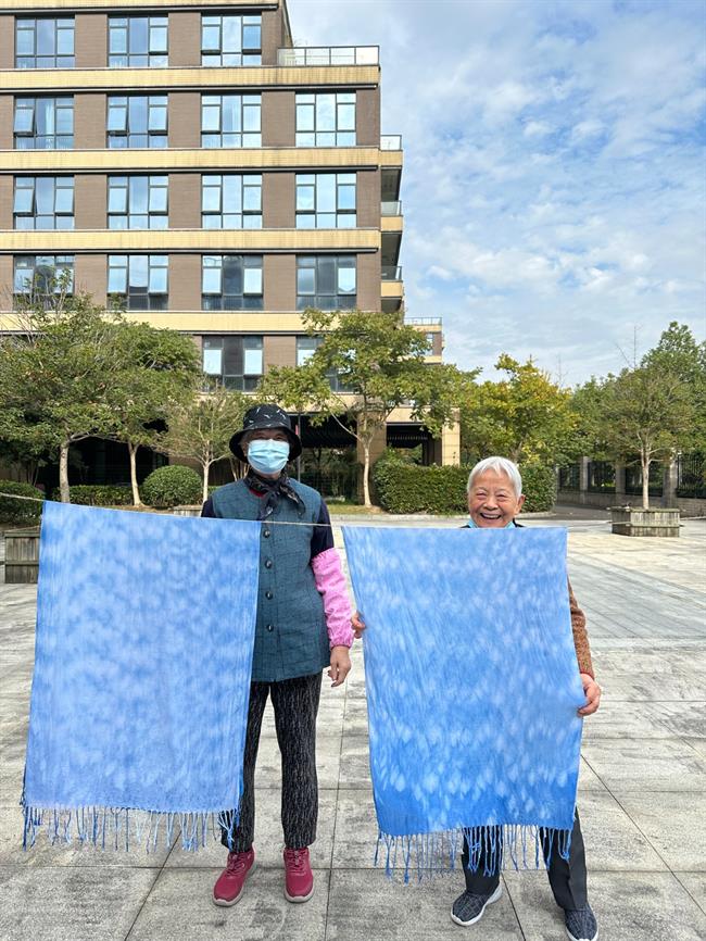 扎染體驗(yàn)活動(dòng)中,老人們?cè)趲熒鷪F(tuán)隊(duì)的幫助下通過(guò)扎、縫、縛、綴、夾等看似無(wú)跡可尋的操作技巧,并參與靛藍(lán)上色和拆線晾曬,制作出了獨(dú)一無(wú)二紋樣的圍巾。