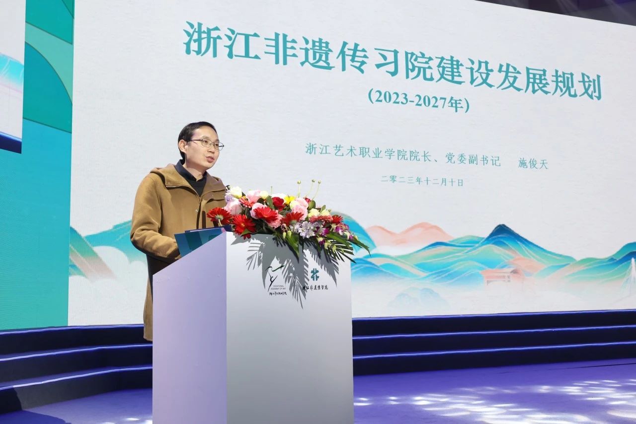 施俊天發(fā)布《浙江非遺傳習(xí)院建設(shè)發(fā)展規(guī)劃(2023年-2027年)》。浙江非遺傳習(xí)院(籌)包括教學(xué)部、研究部、產(chǎn)學(xué)部等部門。教學(xué)部設(shè)立教學(xué)中心與教務(wù)中心,通過優(yōu)化專業(yè)設(shè)置,完善課程建設(shè),建成浙江特色高水平非遺專業(yè)群,打造非遺保護(hù)傳承、經(jīng)營(yíng)管理與傳播的高素質(zhì)復(fù)合型人才培養(yǎng)基地;研究部設(shè)立學(xué)術(shù)研究中心與技術(shù)研發(fā)中心,建立以非遺研究為特色的浙江省哲學(xué)社會(huì)科學(xué)研究基地、技術(shù)研發(fā)與非遺文創(chuàng)高地,打造國(guó)內(nèi)職業(yè)院校領(lǐng)先的高層級(jí)非遺研究與技術(shù)技能研發(fā)平臺(tái);產(chǎn)學(xué)部設(shè)立產(chǎn)業(yè)學(xué)院與實(shí)踐基地,通過校政行企合作,全方位推進(jìn)產(chǎn)教深度融合人才培養(yǎng)模式改革,打造服務(wù)新發(fā)展格局的浙江非遺產(chǎn)教融合共同體。