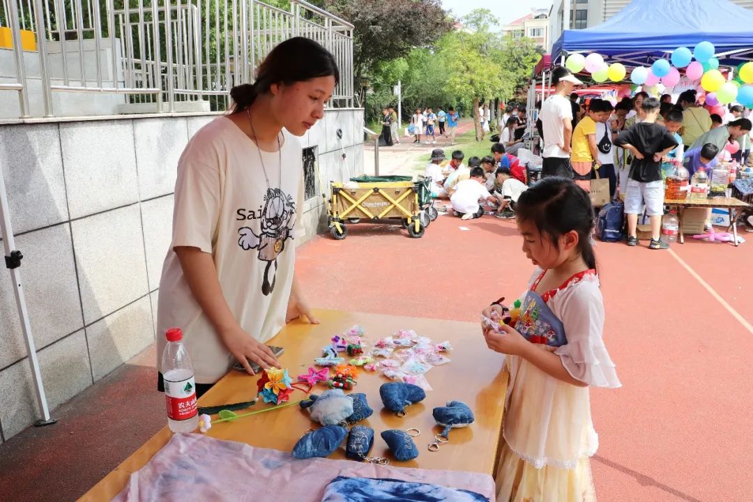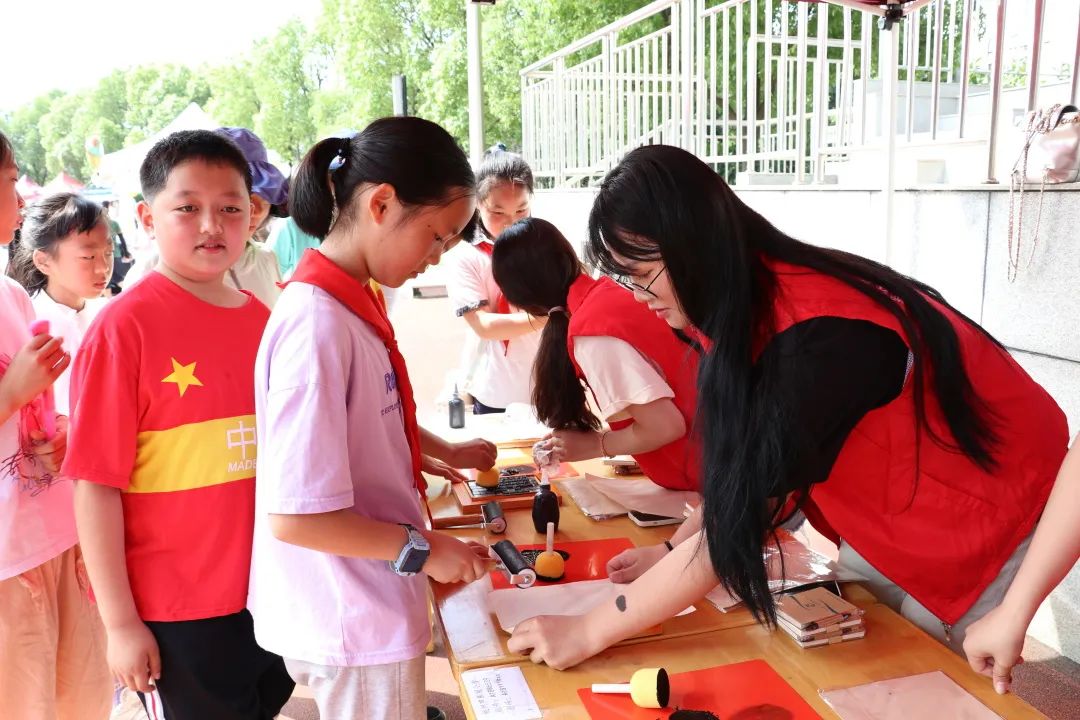 隨后準(zhǔn)確鋪紙,一次定位,再用鬃刷在紙上順次點(diǎn)按,待紙張泛出均勻墨跡,揭開宣紙,一張清秀而生動(dòng)的活字印刷品就展現(xiàn)在大家的面前。撫觸紙上淡淡的浮突,那是活字印刷留下的獨(dú)特壓痕,讓古詩多了一份歷史的韻味。 感受完古色古香的活字印刷,這還有一個(gè)藍(lán)白藝術(shù)交織的扎染小攤。以扎染的手法制作出的包包和雅致的耳環(huán)與方巾,惟妙惟肖的小玩偶等等,無不散發(fā)著獨(dú)具匠心的美感。藝小匠們將自己親手制作的精美文創(chuàng)小商品整齊擺開,路過的老師和孩子們紛紛停下腳步來到攤位上選購物品。 在整個(gè)過程中,小朋友們近距離接觸非遺、了解非遺、體驗(yàn)非遺,讓非遺文化不斷融入孩子學(xué)習(xí)生活,促進(jìn)傳統(tǒng)文化在傳承創(chuàng)新中煥發(fā)新的活力。