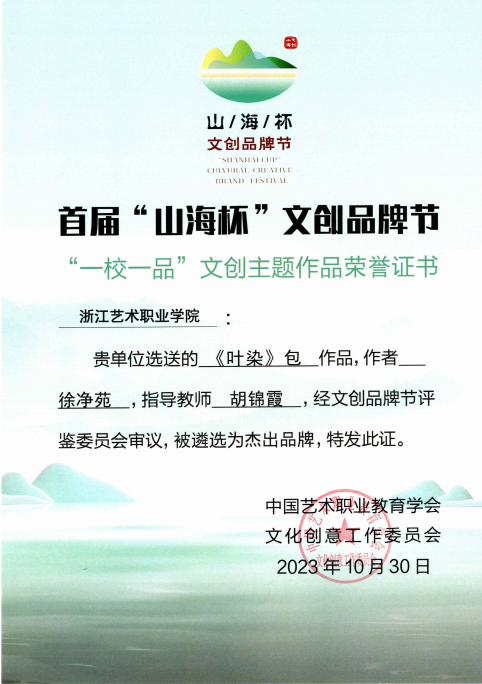 在首屆“山海杯”文創(chuàng)品牌節(jié)“一校一品”的評選中,浙江藝術(shù)職業(yè)學(xué)院以手工藝主題作品展榮獲“一校一品”杰出品牌,成為全國8個杰出品牌之一。我院選送參展的7項文創(chuàng)主題作品,全部榮獲“一校一品”文創(chuàng)主題作品杰出品牌獎并展出。首屆“山海杯”文創(chuàng)品牌節(jié)“一校一品”活動由中國藝術(shù)職業(yè)教育學(xué)會指導(dǎo)、中國藝術(shù)職業(yè)教育學(xué)會文化創(chuàng)意工作委員會主辦。