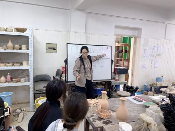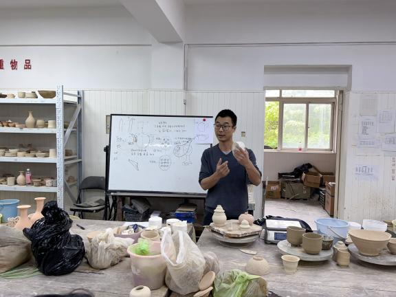 課程中,授課老師傅菲菲和鄭源雷從茶文化和茶具的歷史發(fā)展切入,通過現(xiàn)場示范和講授的模式,借助殘器標(biāo)本向?qū)W生們闡釋茶具制作的重難點,引導(dǎo)學(xué)生從“用”和“美”的角度出發(fā),創(chuàng)作出符合當(dāng)代審美和實用價值的茶壺器具。