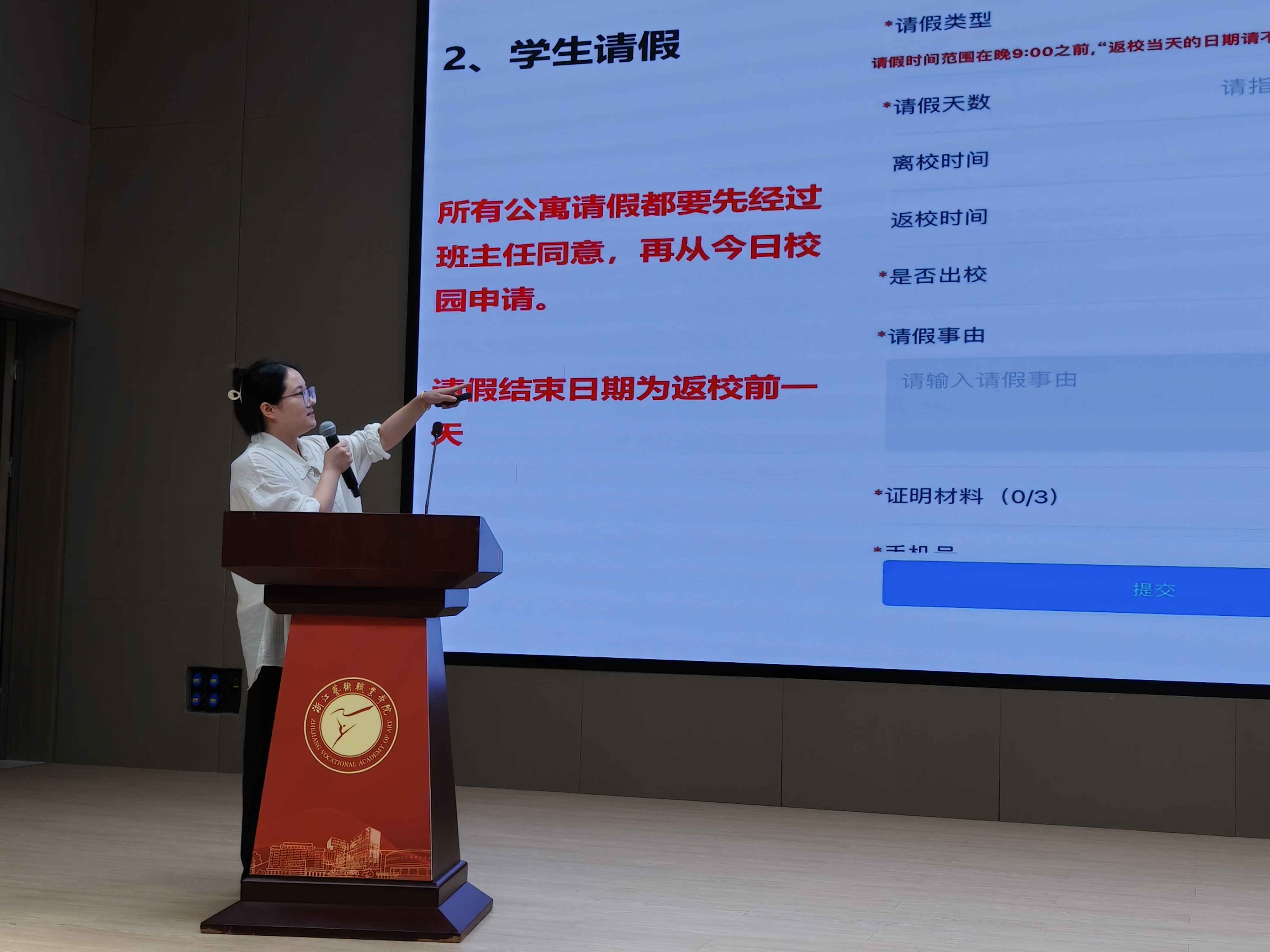 學(xué)風(fēng)紀(jì)律講座上,輔導(dǎo)員胡墨智麗重點解讀學(xué)校學(xué)風(fēng)檢查標(biāo)準(zhǔn)與學(xué)工系統(tǒng),演示“今日校園”APP的上課簽到、公寓請假等功能操作,引導(dǎo)新生樹立規(guī)則意識,以良好狀態(tài)開啟大學(xué)旅程。