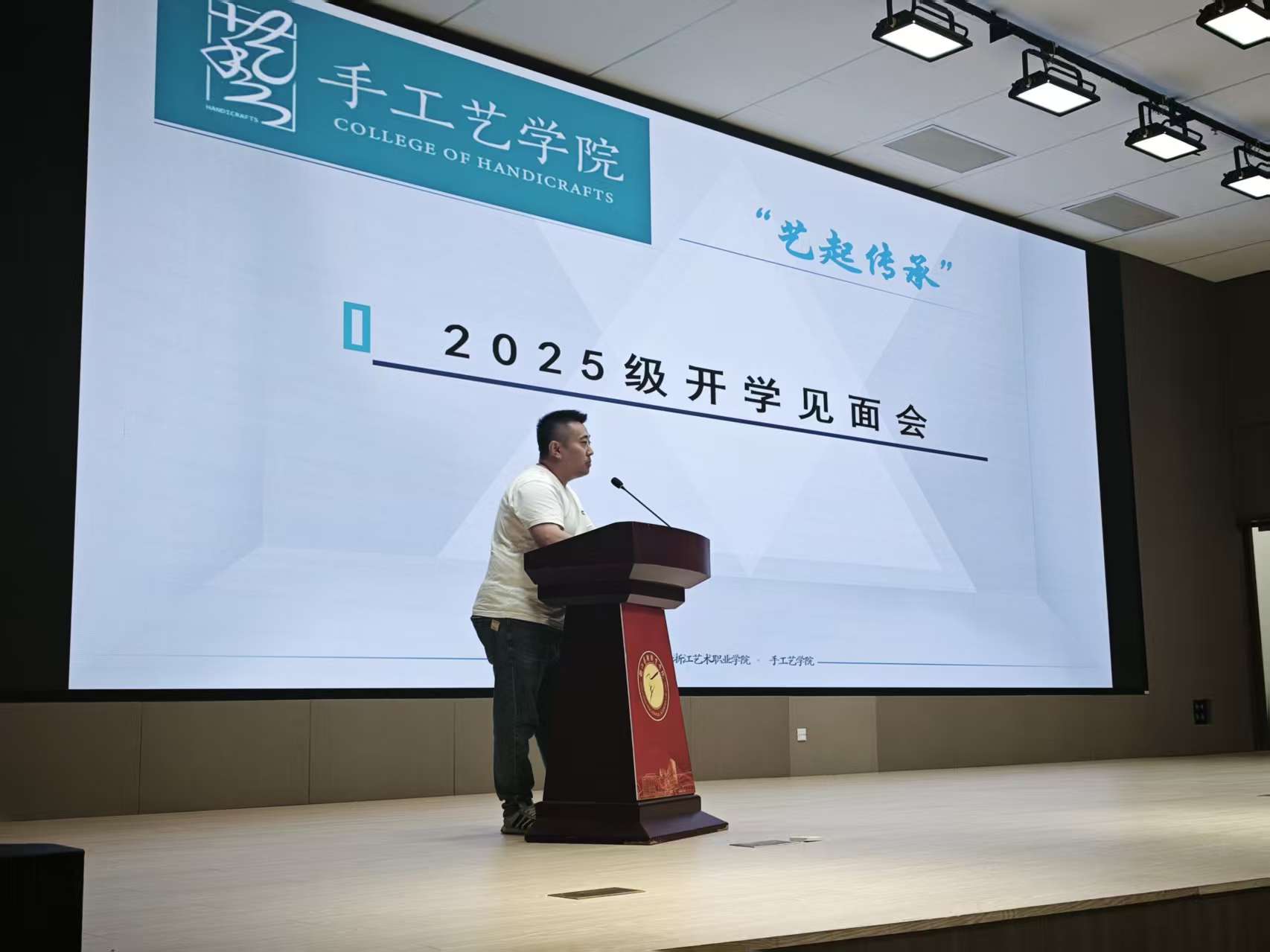 藝路綻放,青春飛揚。9月15日,手工藝學(xué)院于報告廳舉行2025級新生見面會及始業(yè)教育。大會由黨總支副書記陳琳主持,學(xué)院領(lǐng)導(dǎo)班子、各專業(yè)教研室主任、行政團隊、2025級新生班主任及全體新生參會。