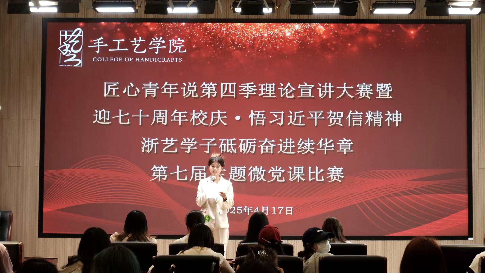 為進一步學習貫徹習近平同志致浙江藝術職業(yè)學院建校70周年校慶賀信精神,更好地宣傳黨的理論創(chuàng)新成果,以匠心續(xù)寫傳統(tǒng)手工藝的絢麗華章,4月17日中午,手工藝學院在新教學樓A102小報告廳舉辦“匠心青年說”第四季理論宣講大賽暨“迎七十周年校慶·悟習近平賀信精神浙藝學子砥礪奮進續(xù)華章”第七屆主題微黨課比賽。10名手工藝學子為大家呈現(xiàn)了一場獨具匠心、聲情并茂的宣講盛宴。
