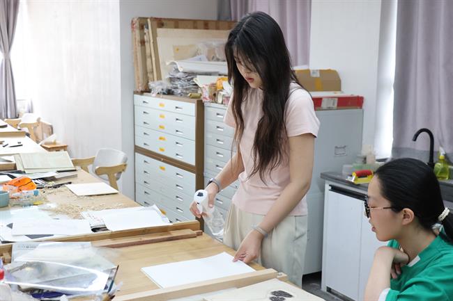 活動(dòng)伊始,學(xué)生志愿者詳細(xì)講解水印木刻的歷史淵源、藝術(shù)特色、制作工具及具體操作流程。從刻板的技巧,到顏料的調(diào)配與印制手法,志愿者們耐心細(xì)致地示范,讓同學(xué)們對這項(xiàng)傳統(tǒng)藝術(shù)有了初步認(rèn)知。