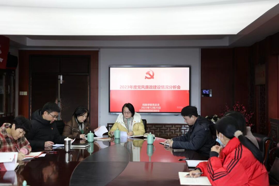 為進一步貫徹落實全面從嚴治黨要求,推進黨風廉政建設,鞏固深化主題教育成果,根據(jù)學校統(tǒng)一部署,12月25日,戲曲學院召開2023年度黨風廉政建設情況分析會。校黨委委員、副校長支濤,戲曲學院領導班子成員,辦公室主任、組織員、黨風廉政建設監(jiān)督員、黨支部書記、教研室主任代表以及校紀委辦公室干事等參加。會議由黨總支書記謝志勇主持。