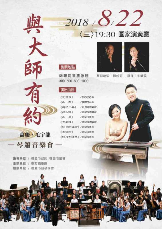 為促進(jìn)海峽兩岸文化交流,我系青年古琴教師高珊于2018年8月22日在臺(tái)北國(guó)家音樂(lè)廳舉辦了“與大師有約”——高珊、毛宇龍琴簫音樂(lè)會(huì)。