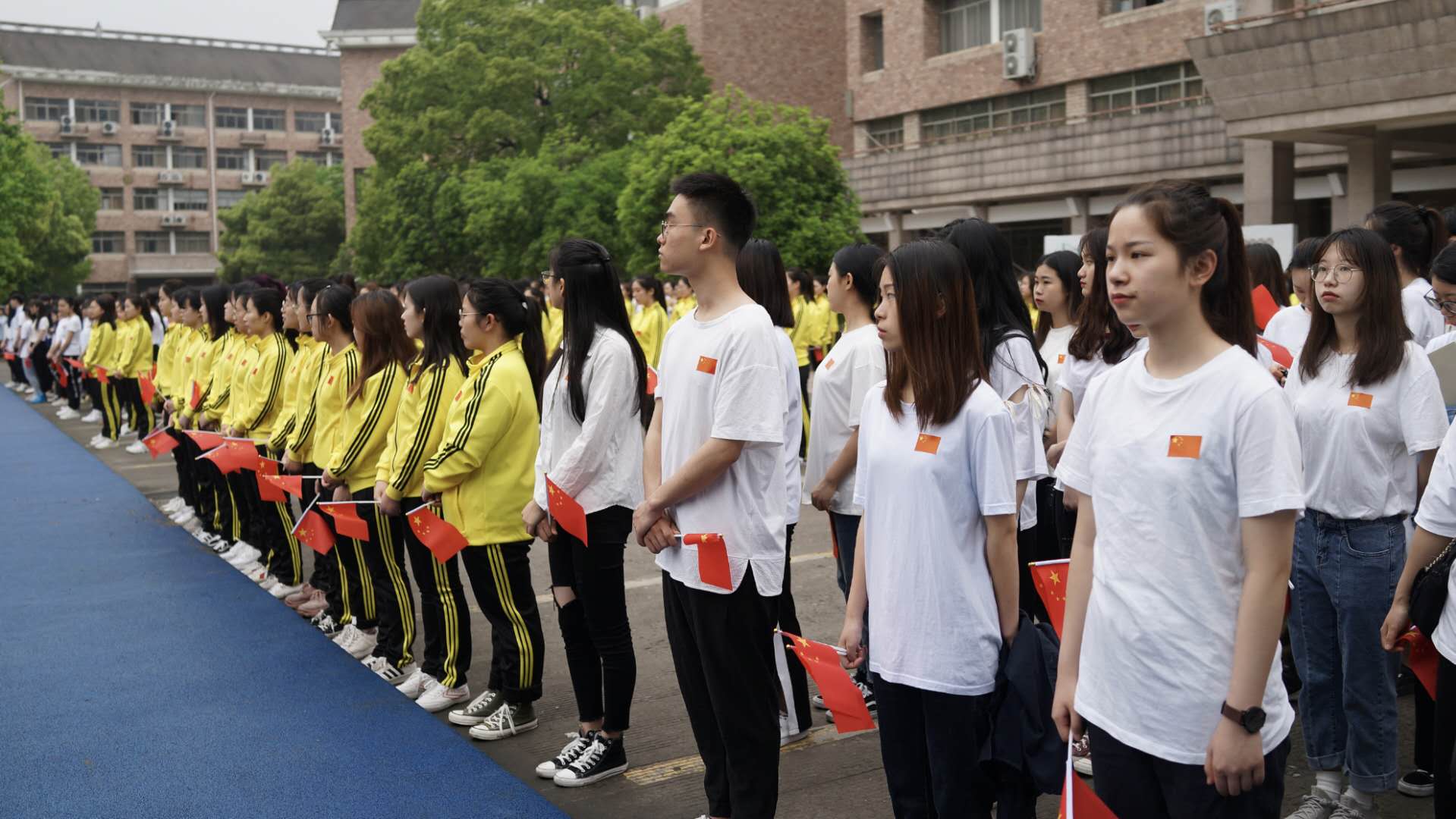 活動(dòng)現(xiàn)場(chǎng),56名歌舞專業(yè)學(xué)生共同舉起國(guó)旗,蘊(yùn)含著56個(gè)民族對(duì)偉大祖國(guó)的熱愛。在廣場(chǎng)正中央,100名聲樂專業(yè)學(xué)生身著黃色外套,排出了“70”的字樣,慶祝新中國(guó)成立70周年、紀(jì)念五四運(yùn)動(dòng)100周年。全體學(xué)生身著白色T恤、深色褲子,在廣場(chǎng)兩側(cè)整齊排列。