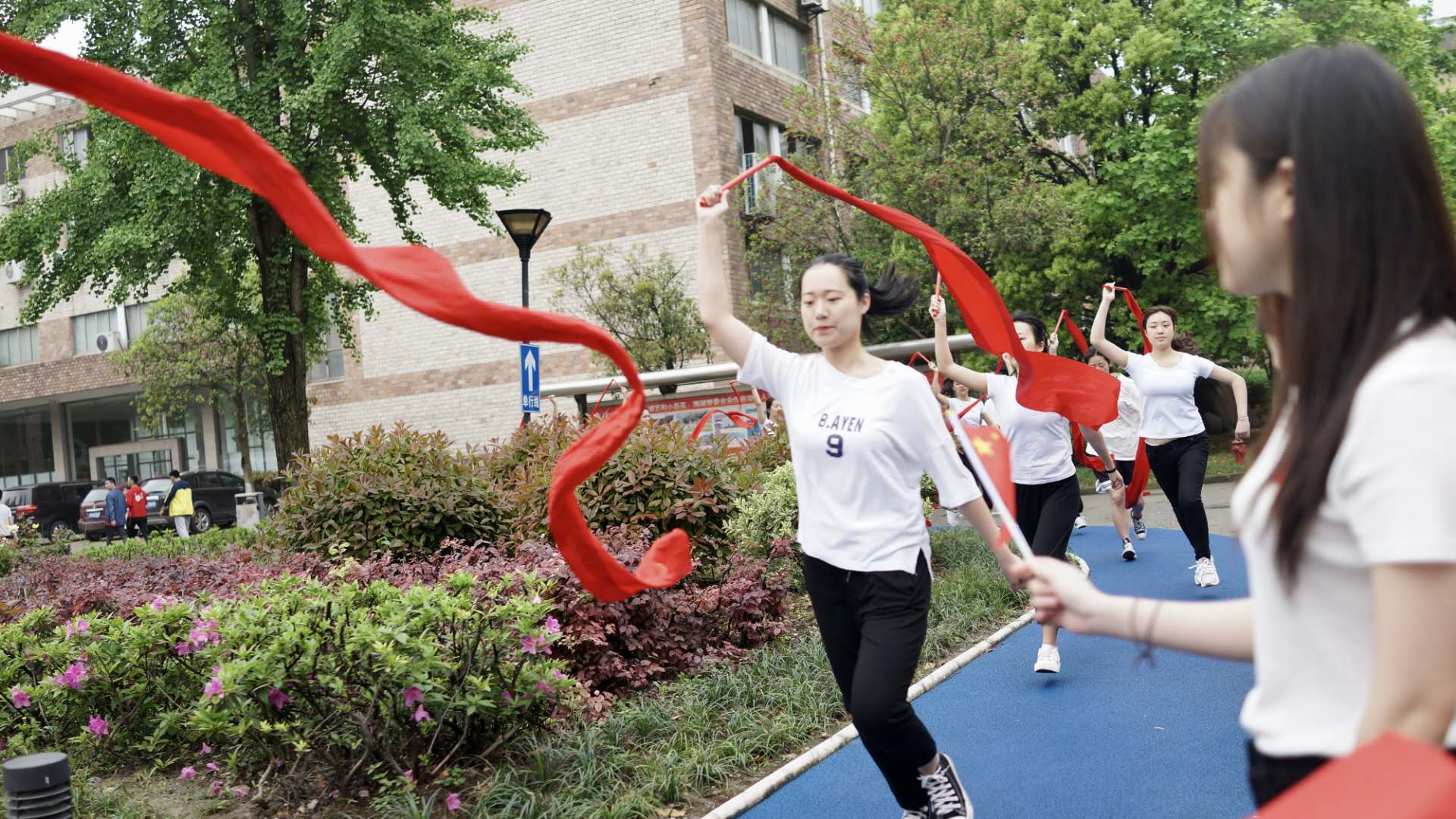 “我和我的祖國(guó),一刻也不能分割,無(wú)論我走到哪里,都流出一首贊歌。我歌唱每一座高山,我歌唱每一條河,裊裊炊煙小小村落,路上一道轍。”在十二面中國(guó)鼓的擂響聲中、在紅綢飄揚(yáng)的舞姿中,全體師生高歌《我和我的祖國(guó)》,用歌聲抒發(fā)對(duì)祖國(guó)的無(wú)限熱愛之情!